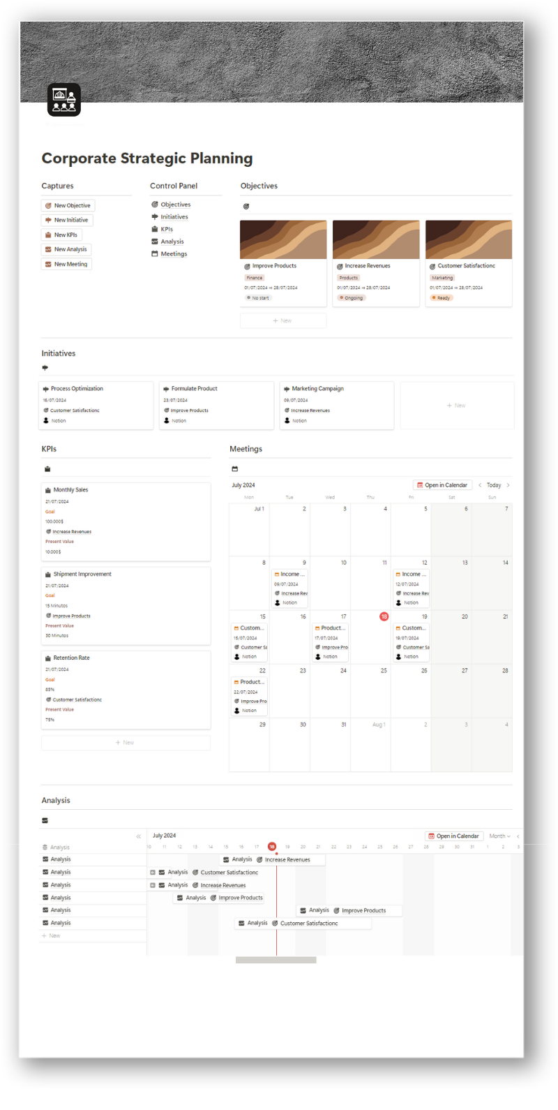 Are you looking for a complete and efficient tool to carry out your company's strategic planning? Our Notion template for Corporate Strategic Planning is designed to help you define, manage and achieve your business goals effectively.