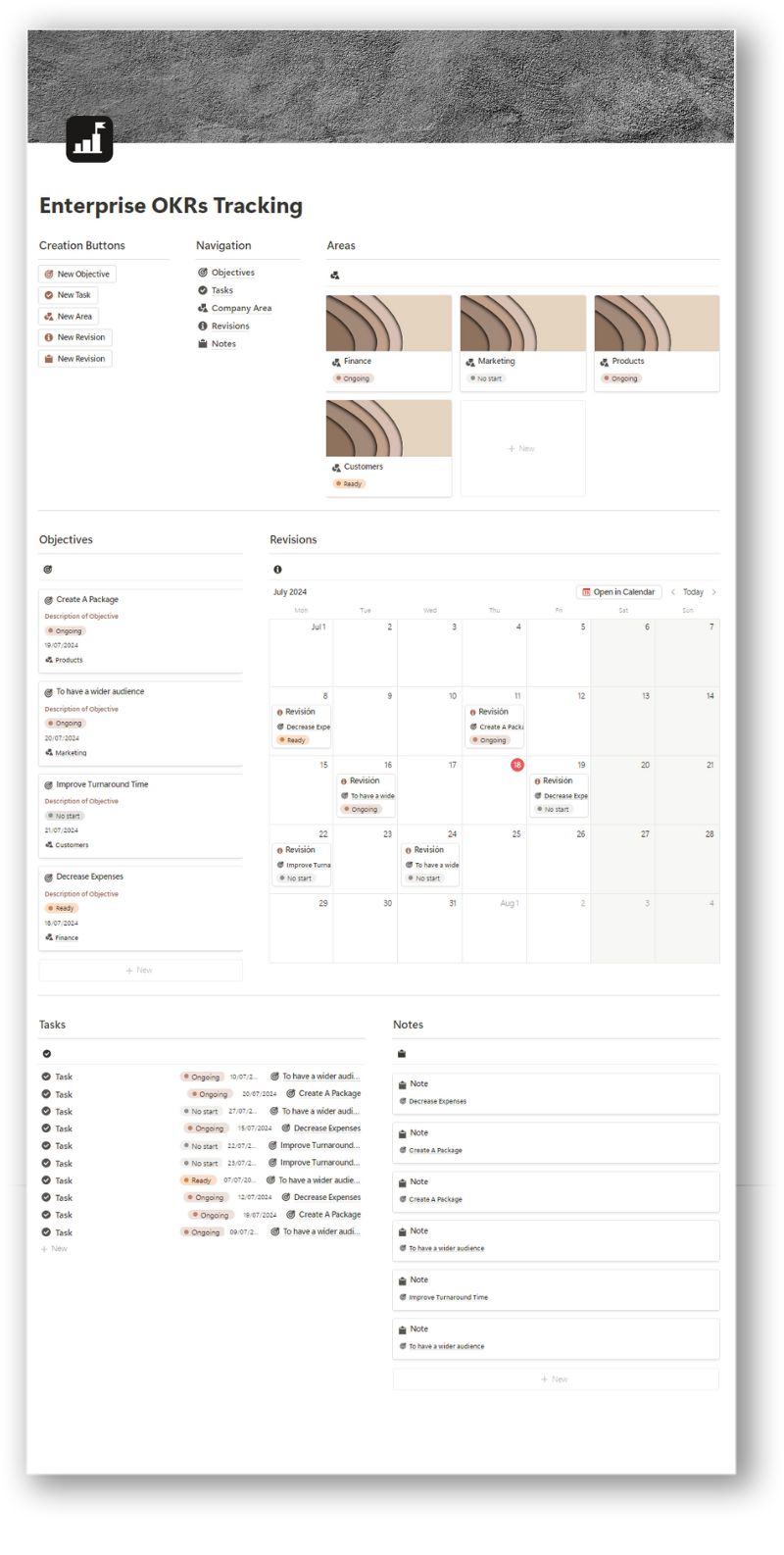 - Areas: Organize your objectives and tasks by specific areas of your company. Maintain a structured and detailed view of each department or key function.